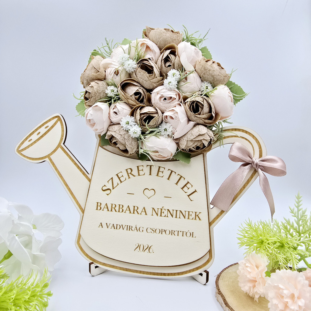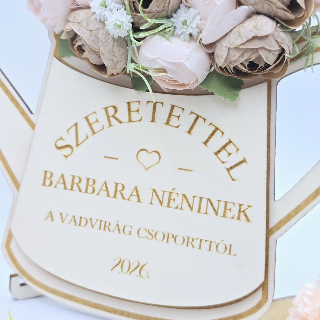 Az öntözőkanna felirata szabadon megválasztható, így teljesen személyre szabható. Legyen szó köszönetről, jókívánságról vagy egyedi üzenetről, a választott szöveg garantáltan különlegessé teszi az ajándékot. A termékre kerülő feliratot a kosárnál található megjegyzés rovatba kérjük pontosan beírni. Abban az esetben tudjuk a képen látható íves elrendezést megtartani, ha az általad kért felirat hosszúsága ezt megengedi. A termékre kerülő feliratot a kosárnál található megjegyzés rovatba kérjük pontosan beírni. A képen látható szöveg kizárólag minta, a te egyedi üzeneted kerül a termékre.