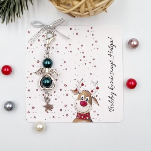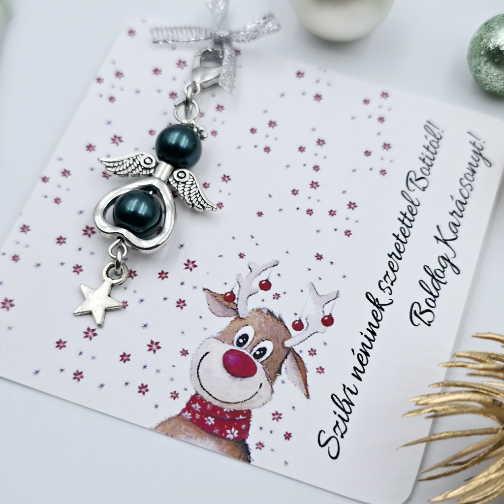 Teklagyöngyből készült angyalka dísz karabinerrel, karácsonyi ajándékkártyán. Több színben választható, személyre szabható ünnepi meglepetés.