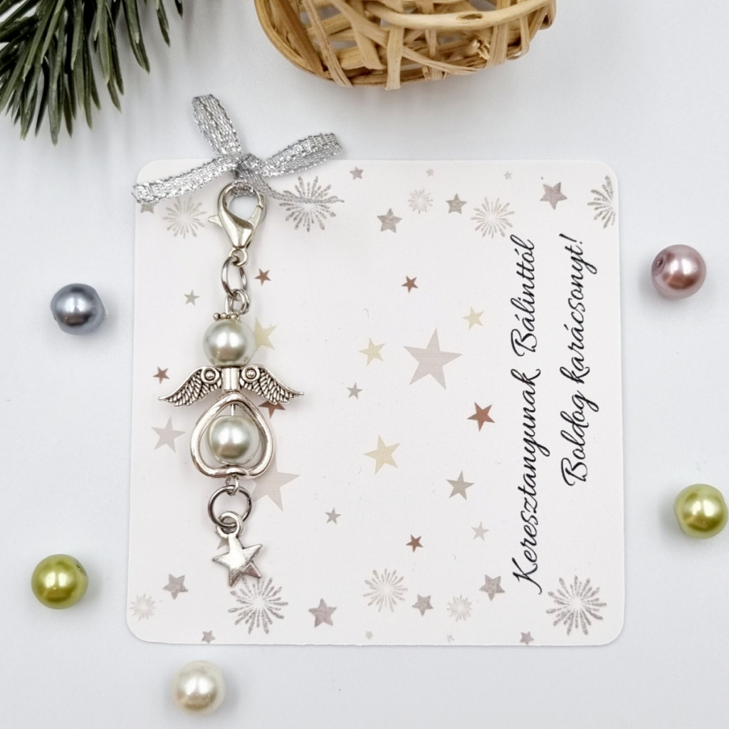 Teklagyöngyből készült angyalka dísz karabinerrel, karácsonyi ajándékkártyán. Több színben választható, személyre szabható ünnepi meglepetés.