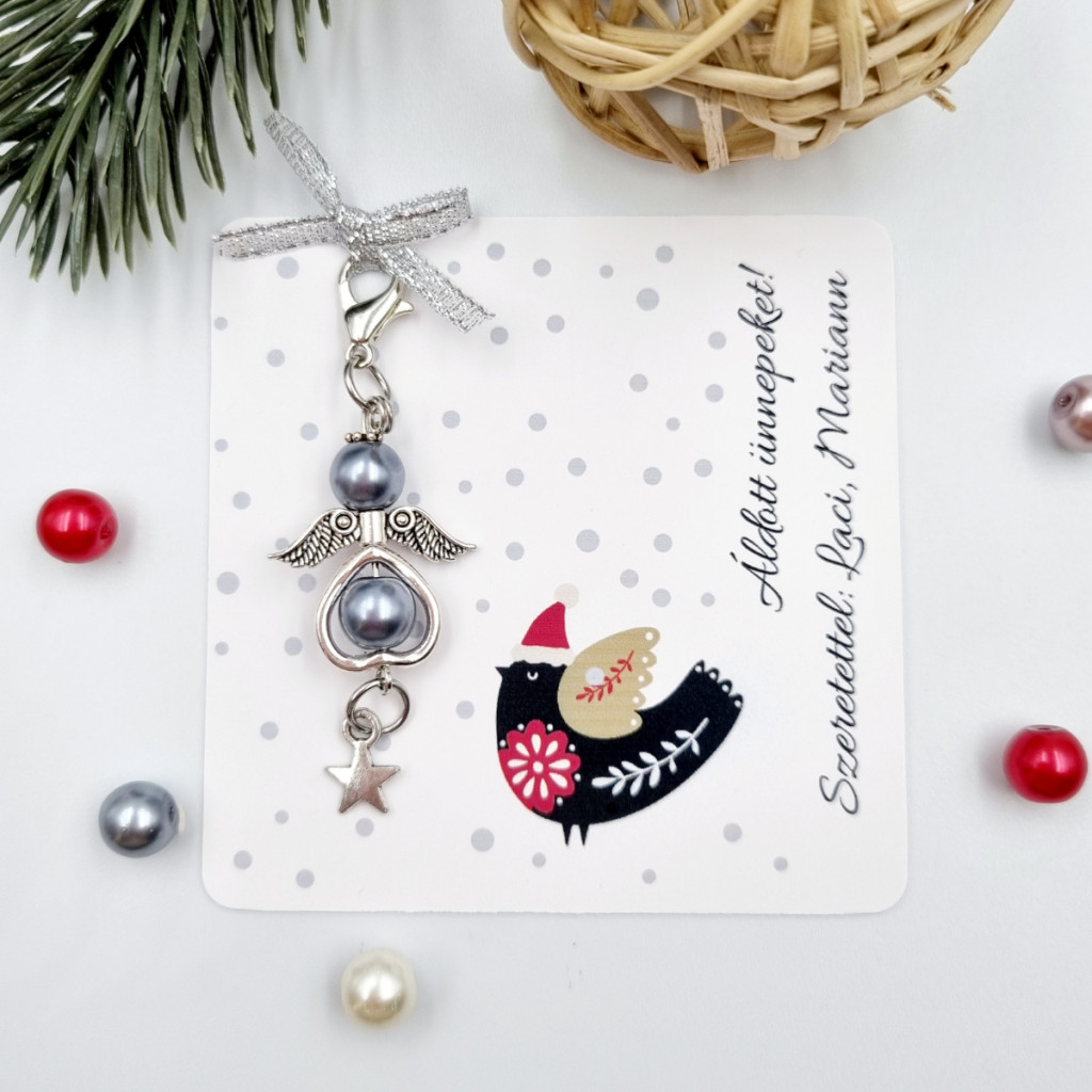 Teklagyöngyből készült angyalka dísz karabinerrel, karácsonyi ajándékkártyán. Több színben választható, személyre szabható ünnepi meglepetés.