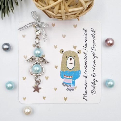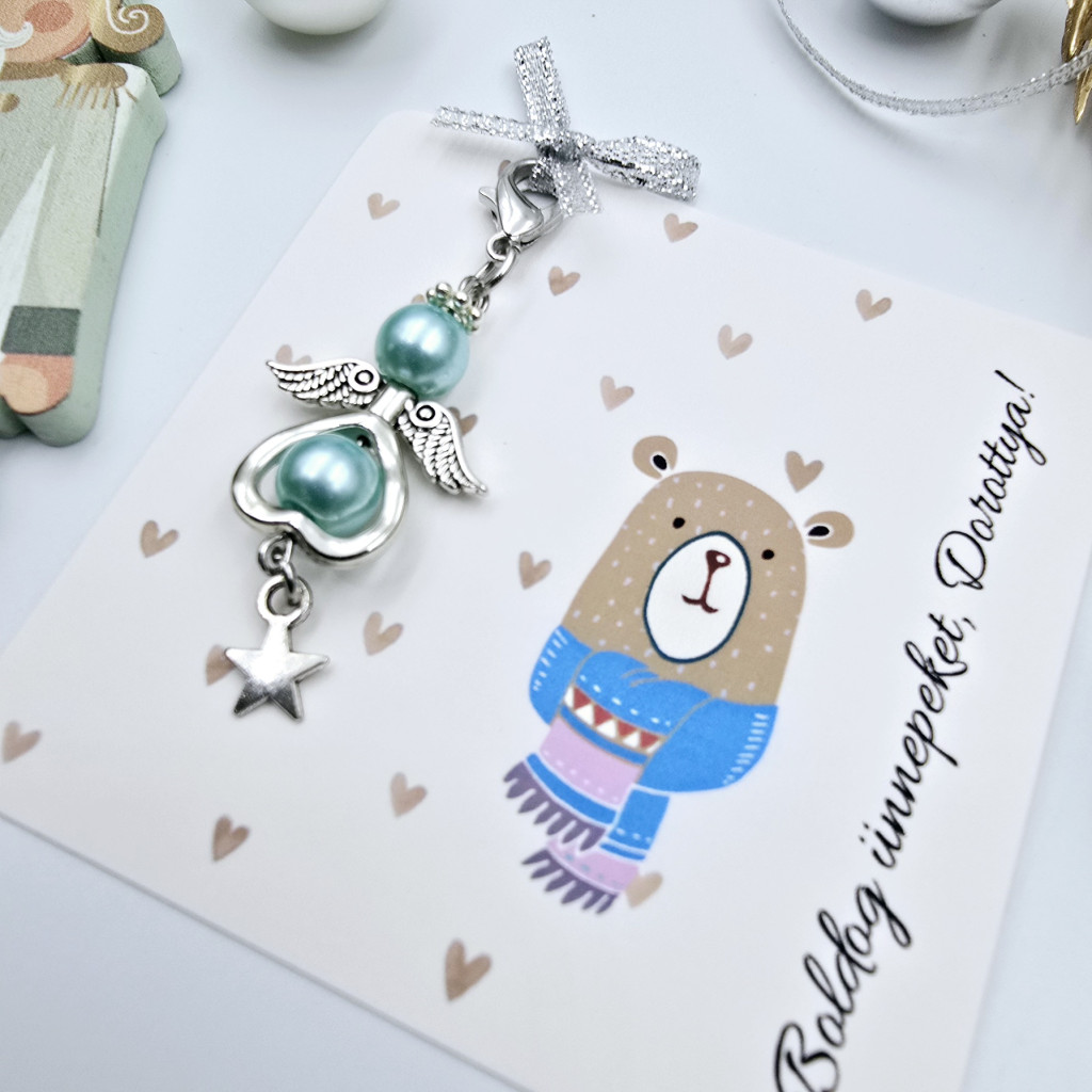 Teklagyöngyből készült angyalka dísz karabinerrel, karácsonyi ajándékkártyán. Több színben választható, személyre szabható ünnepi meglepetés.