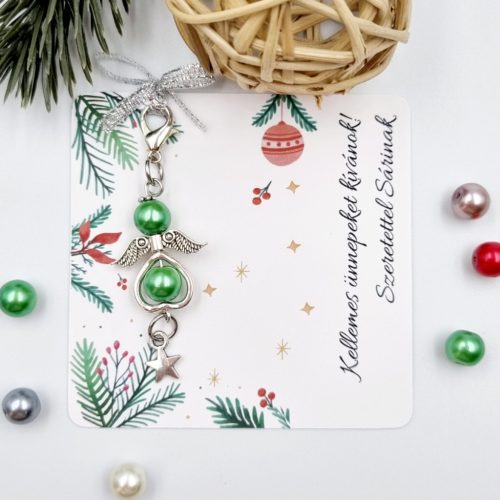 Teklagyöngyből készült angyalka dísz karabinerrel, karácsonyi ajándékkártyán. Több színben választható, személyre szabható ünnepi meglepetés.