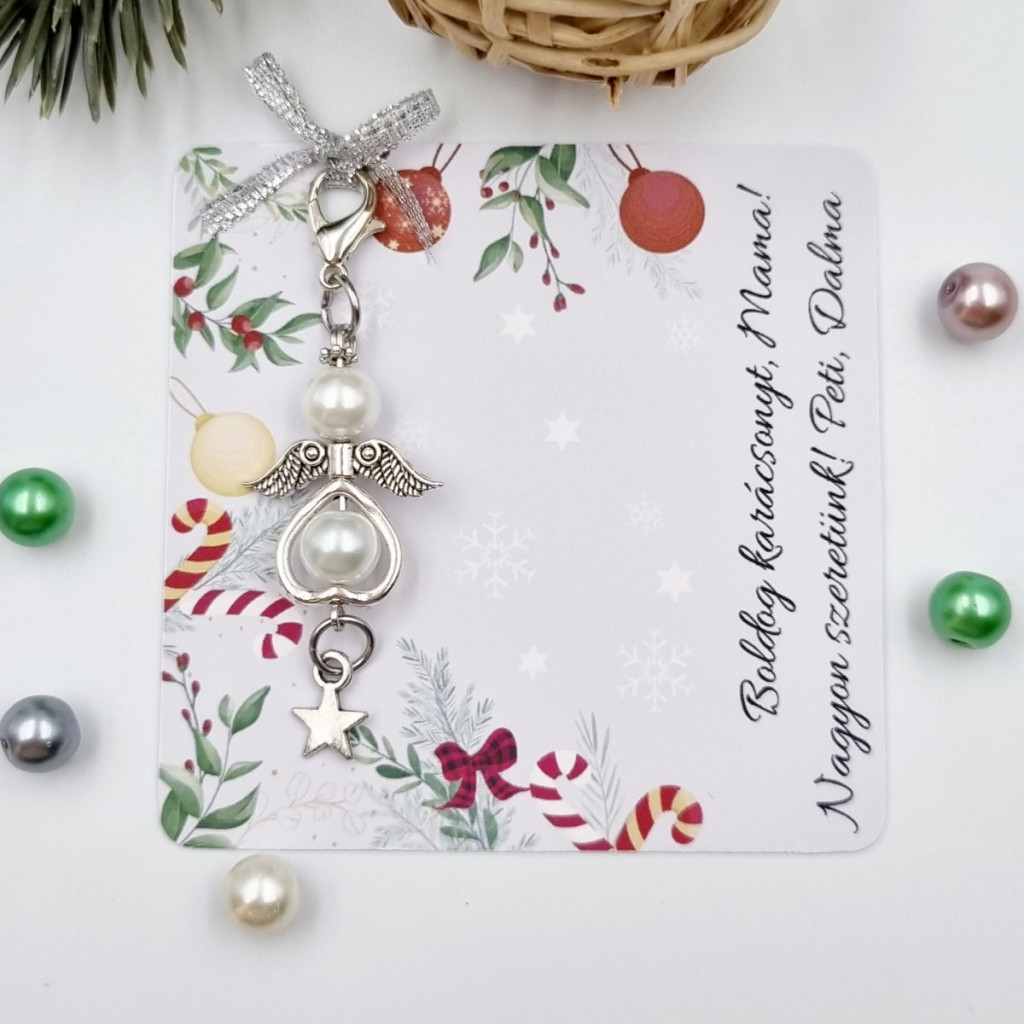 Teklagyöngyből készült angyalka dísz karabinerrel, karácsonyi ajándékkártyán. Több színben választható, személyre szabható ünnepi meglepetés.
