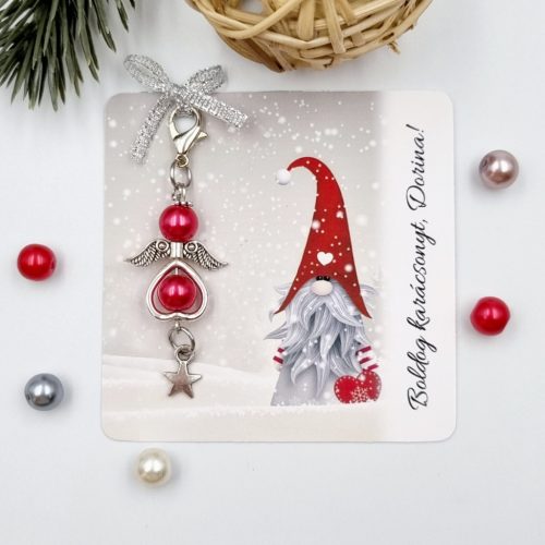 Teklagyöngyből készült angyalka dísz karabinerrel, karácsonyi ajándékkártyán. Több színben választható, személyre szabható ünnepi meglepetés.