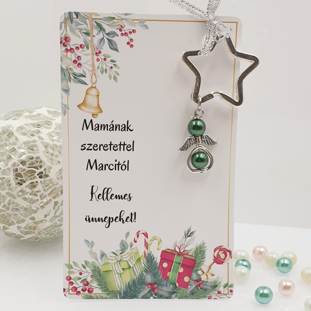 Angyalkás csillag kulcstartó teklagyöngyből, karácsonyi ajándékkártyán. Több színben választható, igényes csomagolásban, kedves apró ajándék karácsonyra.