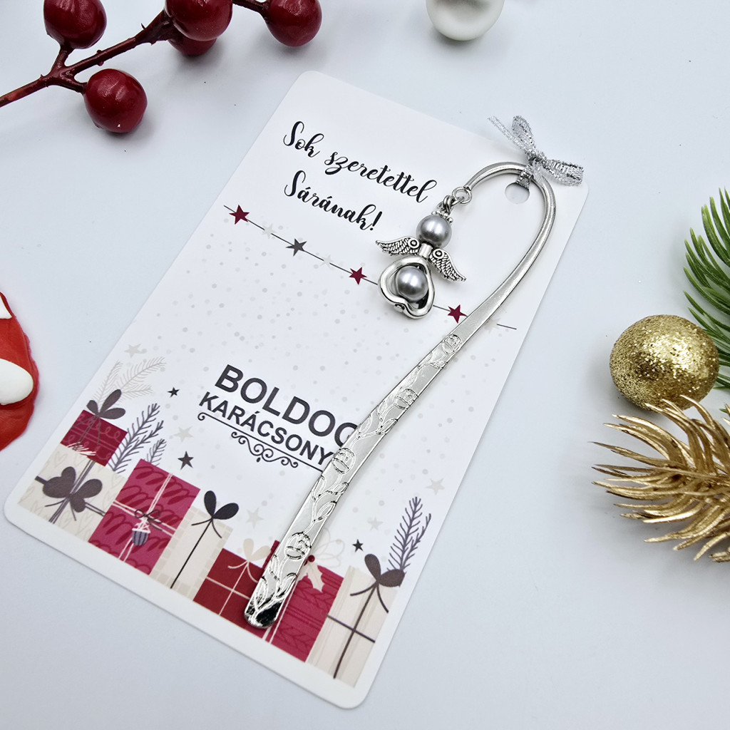 Angyalkás könyvjelző teklagyöngyből, karácsonyi ajándékkártyával. Több színben választható, igényes csomagolásban érkezik, kedves ajándék olvasóknak.