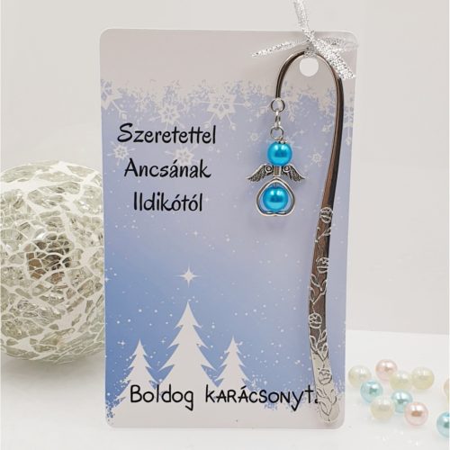 Angyalkás könyvjelző teklagyöngyből, karácsonyi ajándékkártyával. Több színben választható, igényes csomagolásban érkezik, kedves ajándék olvasóknak.