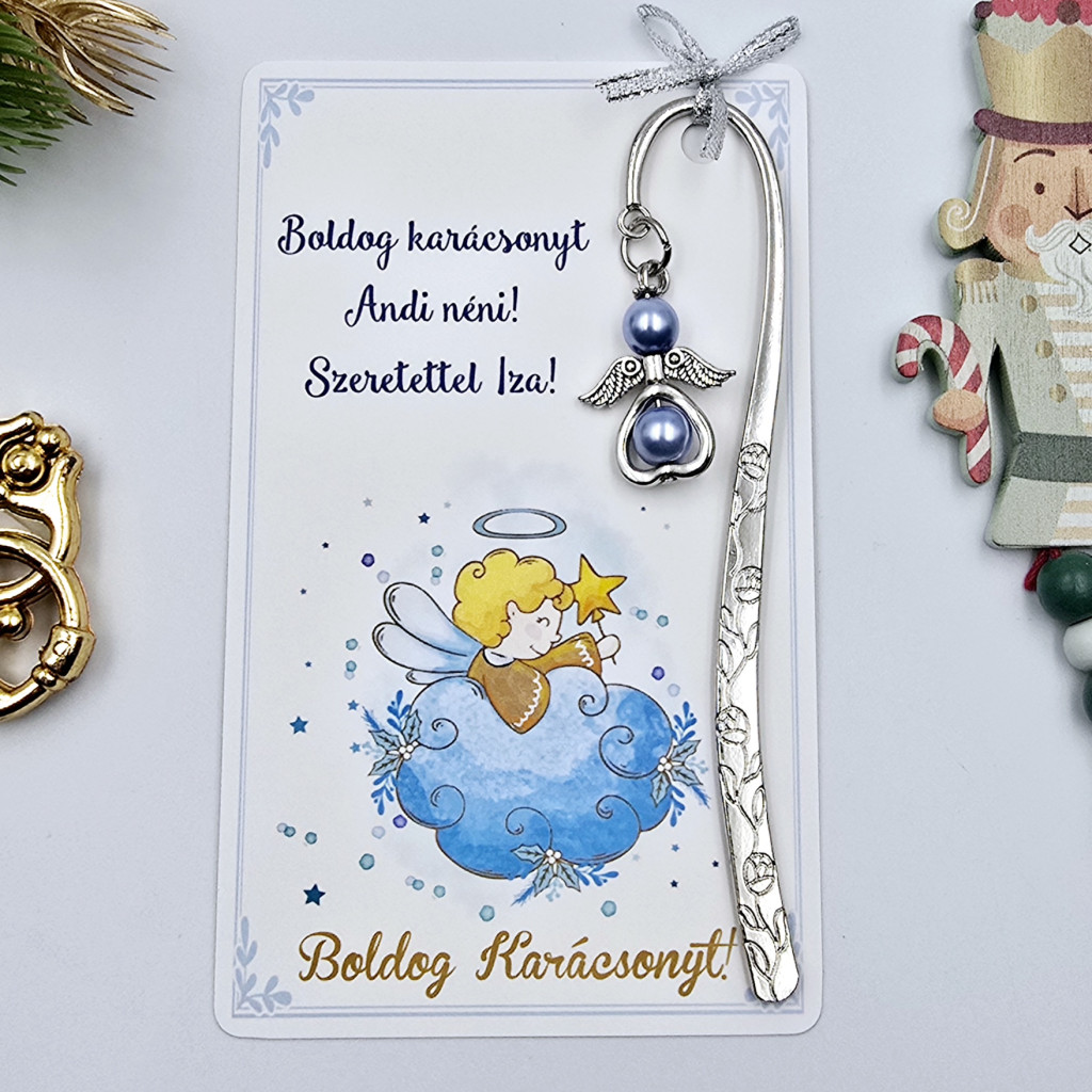 Angyalkás könyvjelző teklagyöngyből, karácsonyi ajándékkártyával. Több színben választható, igényes csomagolásban érkezik, kedves ajándék olvasóknak.