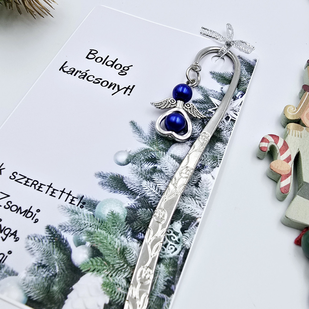 Angyalkás könyvjelző teklagyöngyből, karácsonyi ajándékkártyával. Több színben választható, igényes csomagolásban érkezik, kedves ajándék olvasóknak.