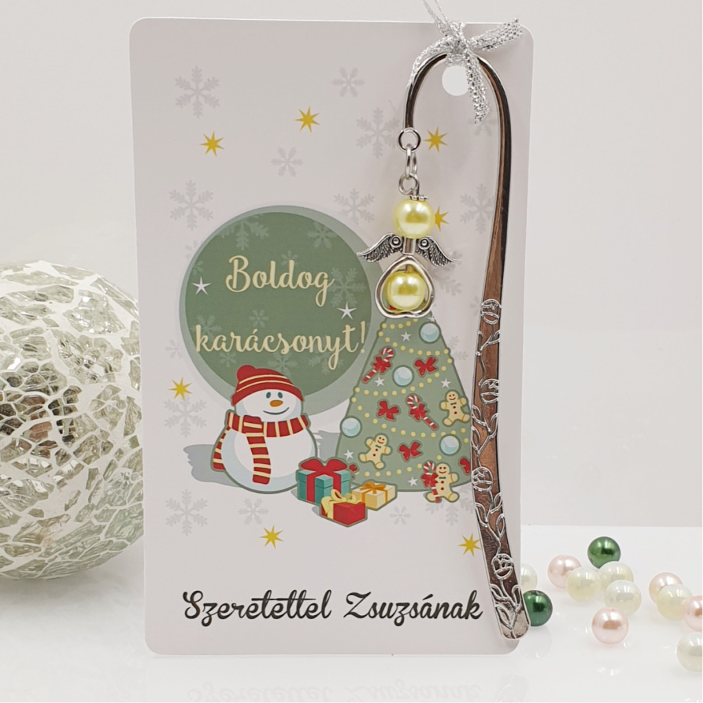 Angyalkás könyvjelző teklagyöngyből, karácsonyi ajándékkártyával. Több színben választható, igényes csomagolásban érkezik, kedves ajándék olvasóknak.