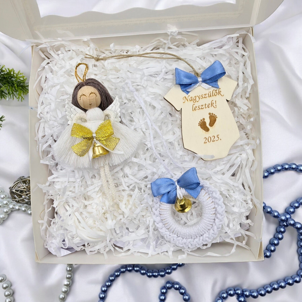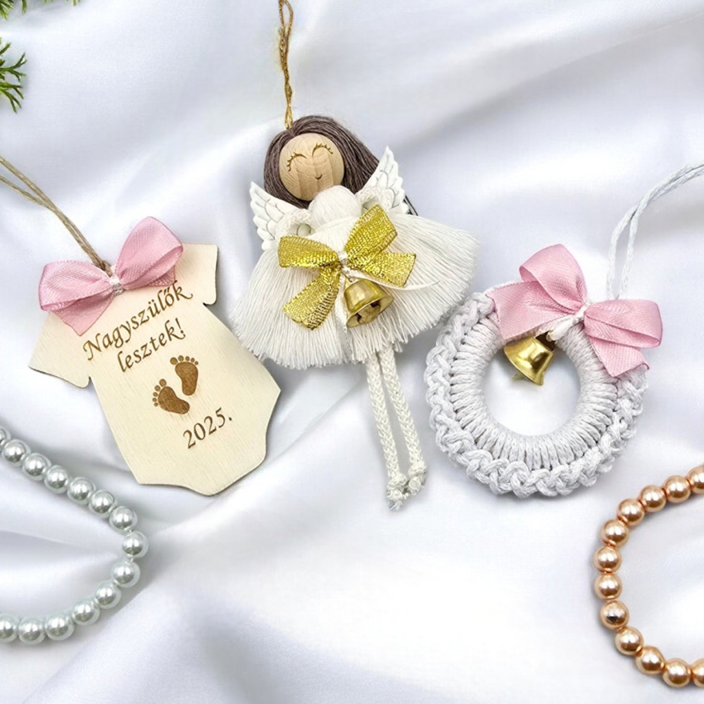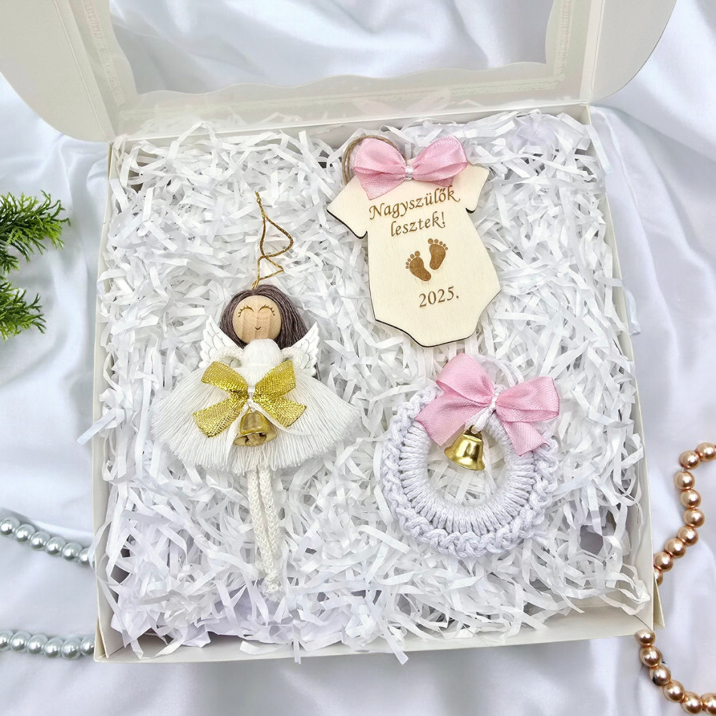 Makramé angyalka csengettyűvel, gravírozott feliratos karácsonyfadísz és horgolt dísz dobozban – szívhez szóló ajándék, amellyel bejelentheted a legszebb hírt az ünnepek alatt.