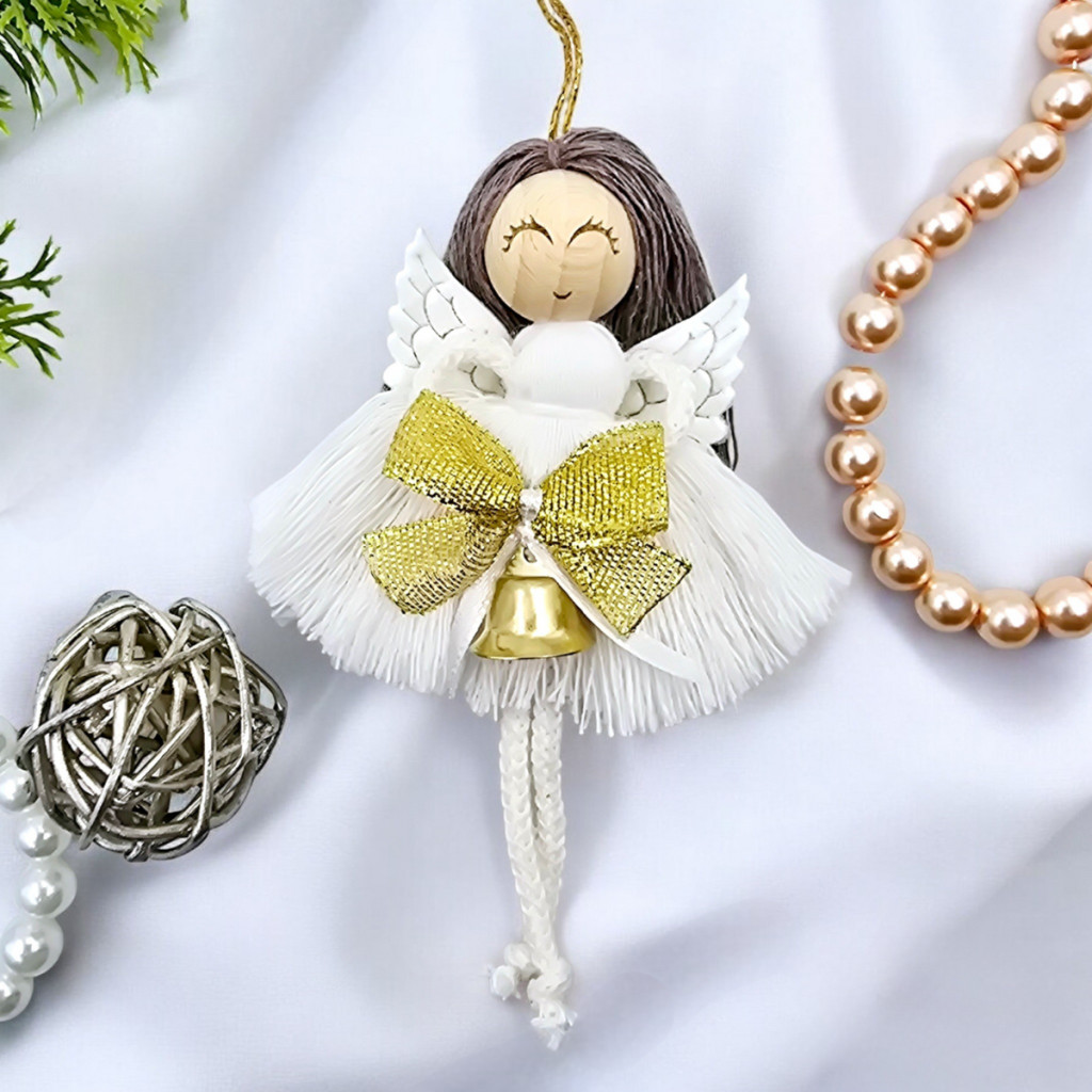 • Makramé angyalka csengettyűvel: kb. 12 cm magas, fehér fonalból készült, barna hajú, arany csengettyűt tart, fehér szárnyakkal díszítve.