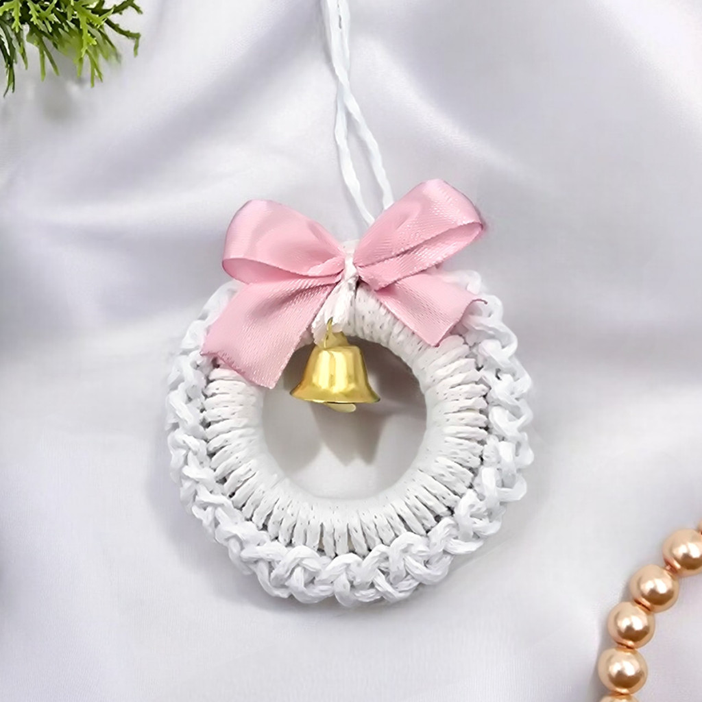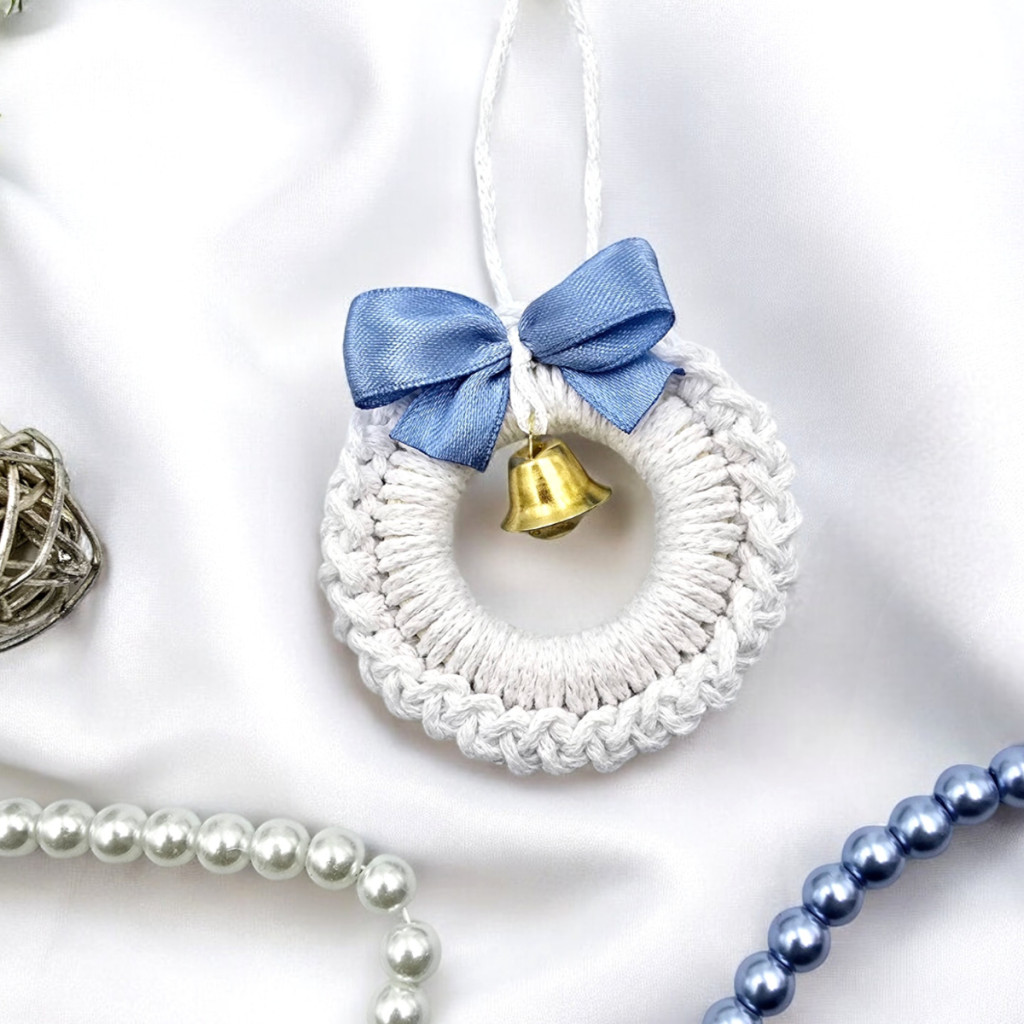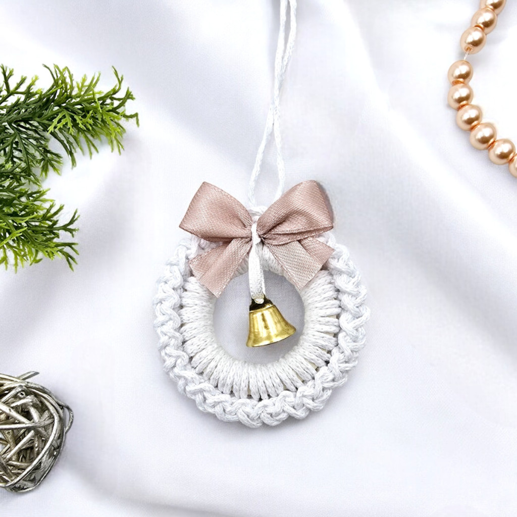 • Horgolt karácsonyfadísz: kb. 6 cm átmérőjű, arany csengettyűvel és bézs szalaggal.