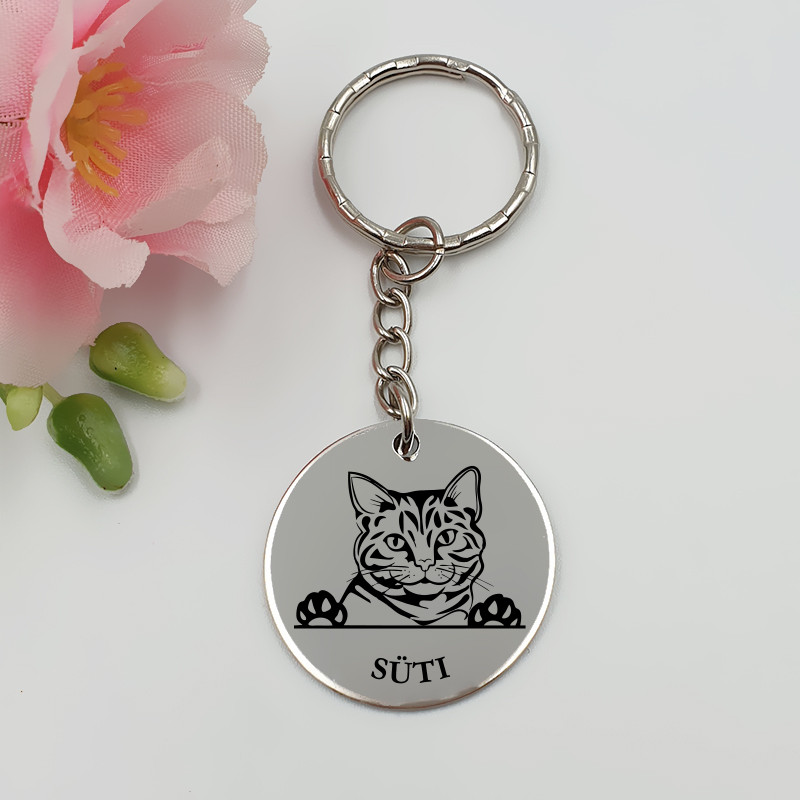 Egyedi cicás kulcstartó. A kulcstartó a képen látható macska grafikával, a te cicád nevével készítjük el.
