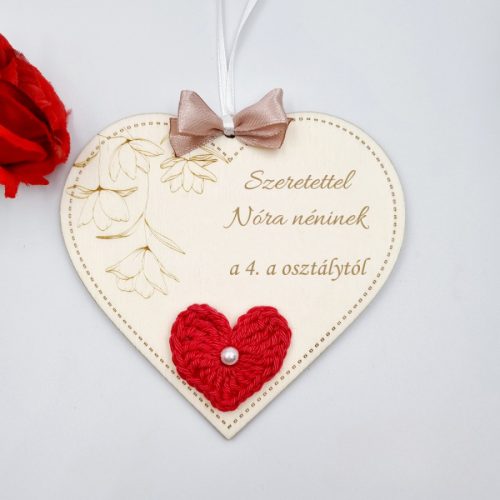 Ez a gravírozott fa szív dísz horgolt virággal és elegáns szatén masnival tökéletes ajándék lehet tanító néniknek vagy óvó néniknek. Egyedi felirattal és választható színekkel teljesen személyre szabható, így évzáróra, ballagásra, vagy bármilyen különleges alkalomra is ideális választás.