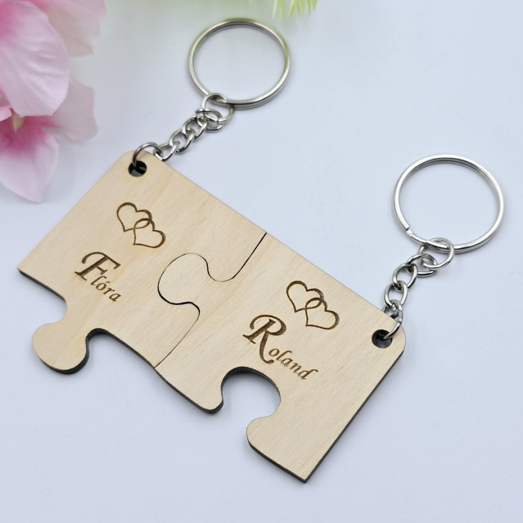 Személyre szabott fa páros kulcstartó egyedi nevekkel. Különleges puzzle formájú kulcstartó lézergravírozott felirattal és romantikus szív motívummal. Pároknak, szerelmeseknek, ajándék évfordulóra vagy Valentin-napra.