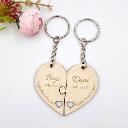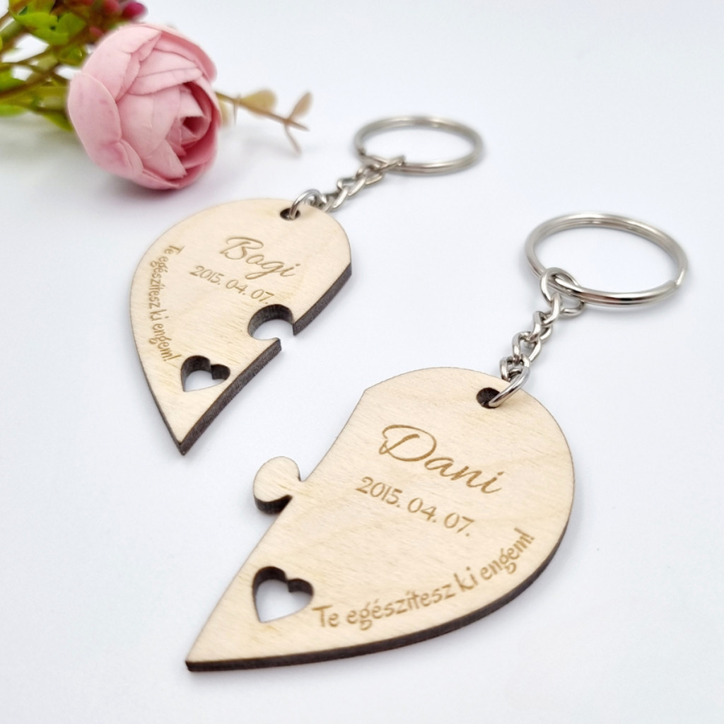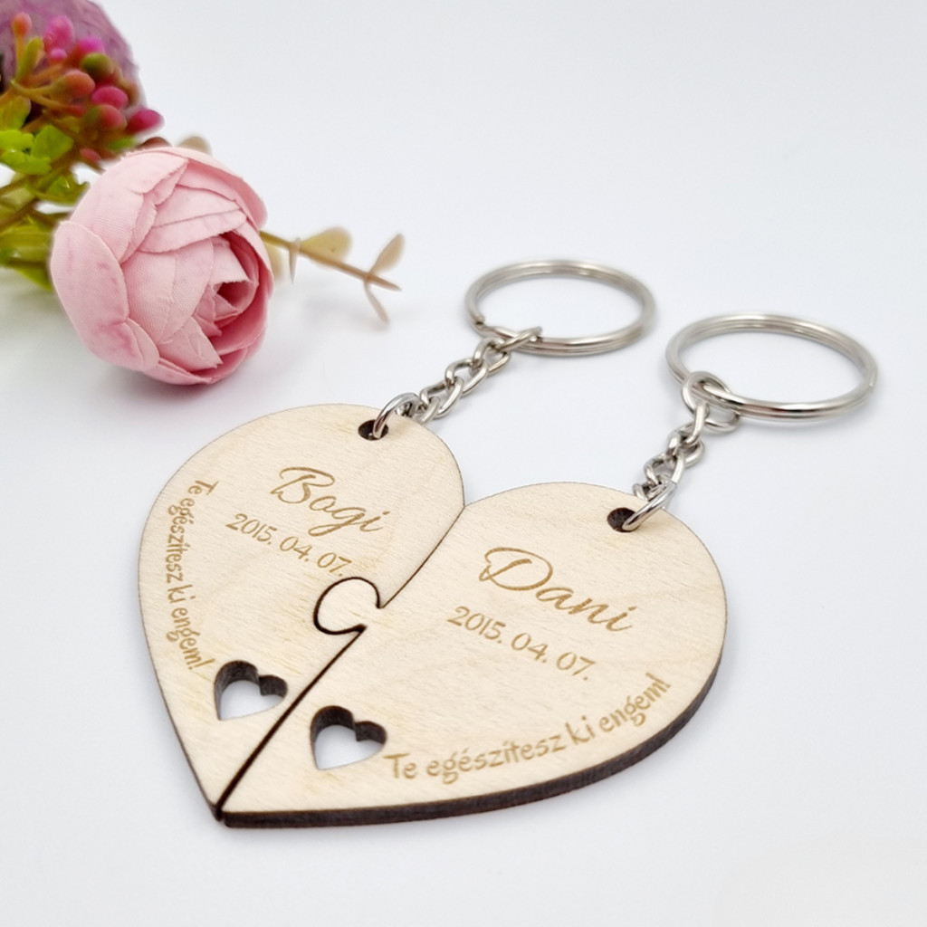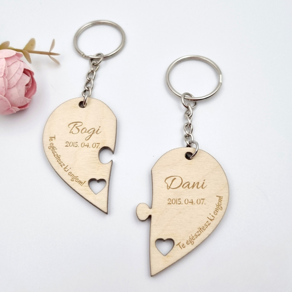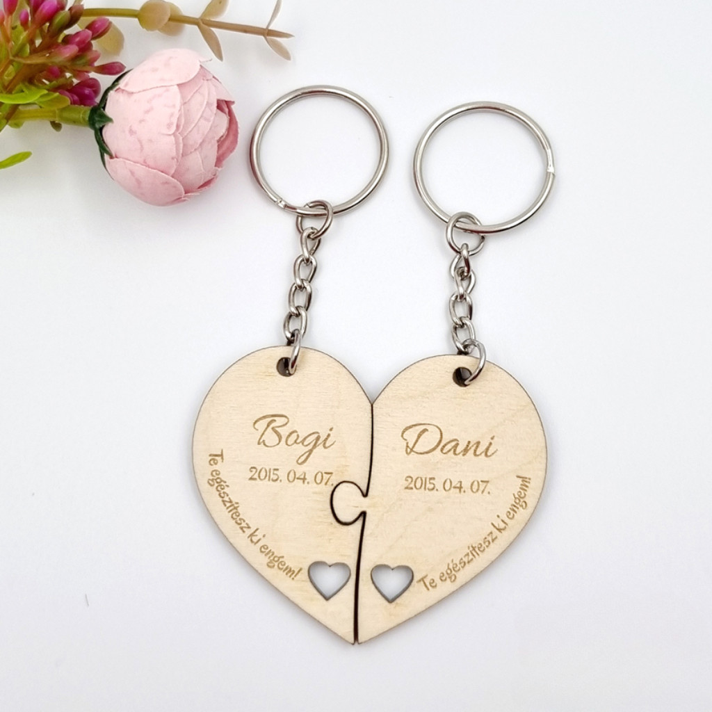 Személyre szabott fa páros kulcstartó egyedi nevekkel és dátummal. Szív alakú puzzle formájú kulcstartó lézergravírozott felirattal. Az "Te egészítesz ki engem" felirat módosítható. Tökéletes ajándék szerelmeseknek, évfordulóra vagy esküvőre.