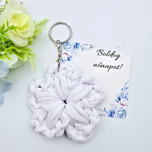 Nőnapi ajándék fehér horgolt virág kulcstartó ajándékkártyával
