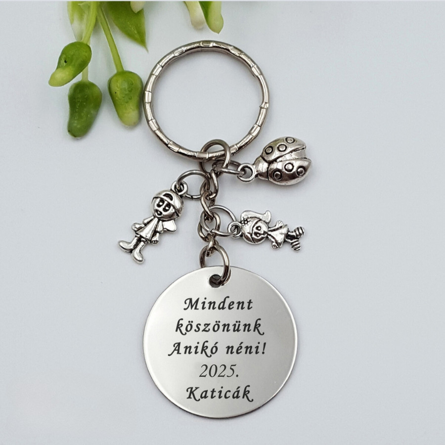 Egyedi gravírozott szöveges kulcstartó óvó néniknek és dajka néniknek, kisfiú, kislány és katica charmokkal. Bármilyen saját felirattal kérhető, így tökéletes ajándék pedagógusnapra, ballagásra vagy év végére.
