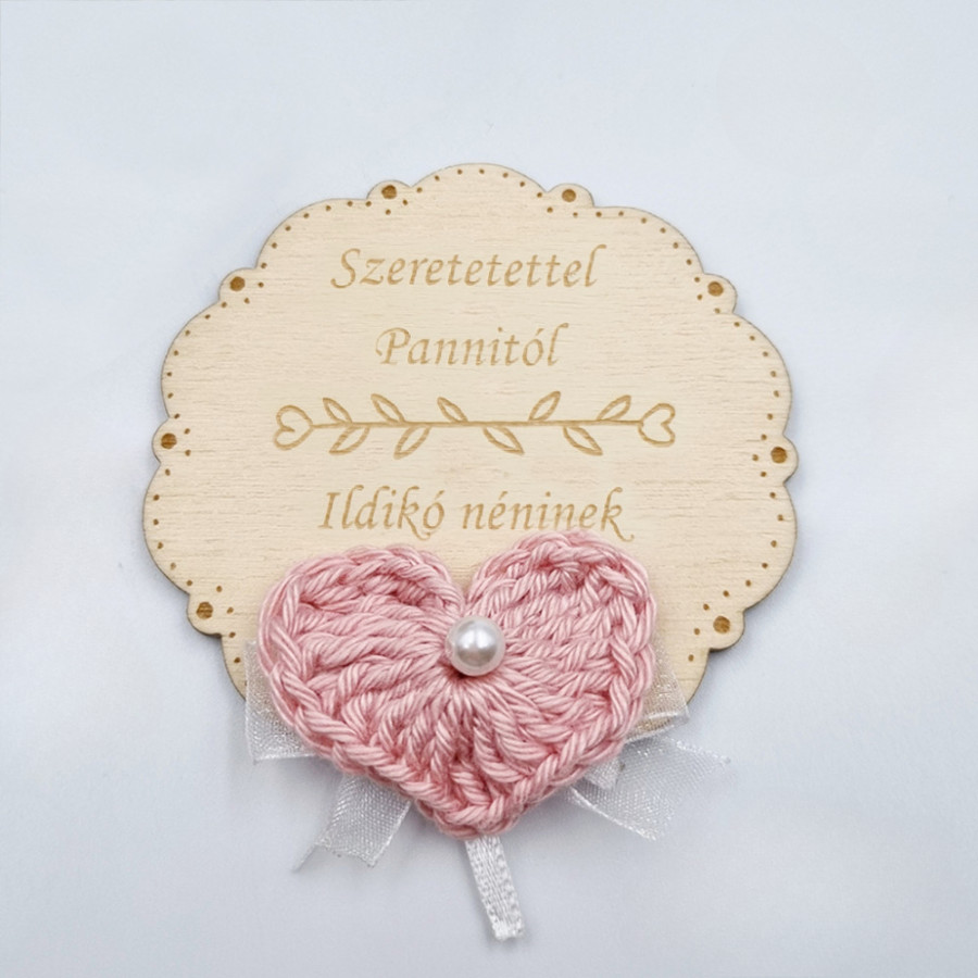 Gravírozott fa hűtőmágnes egyedi felirattal, horgolt szívvel (20 féle szín)