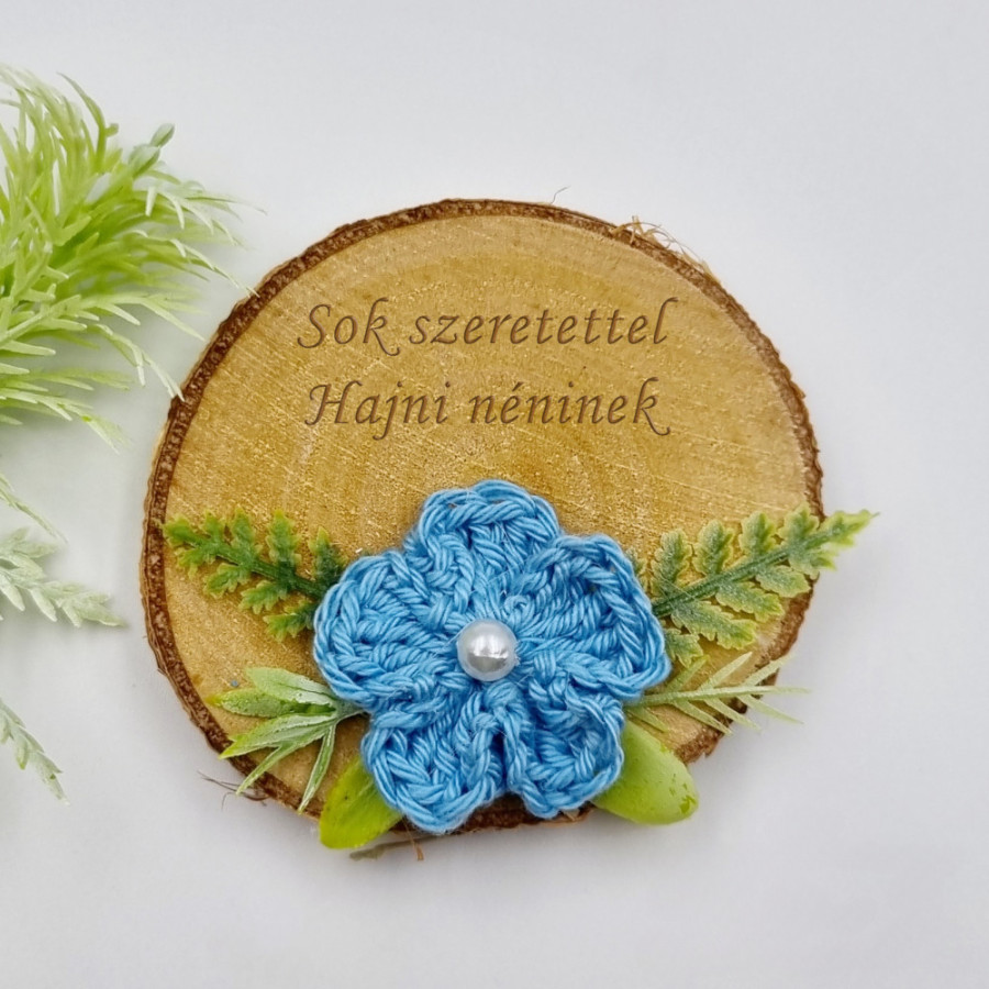 Gravírozott fa hűtőmágnes egyedi felirattal, horgolt virággal (20 féle szín)