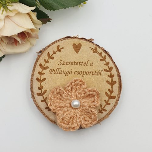 Gravírozott fa hűtőmágnes egyedi felirattal, horgolt virággal (20féle szín)