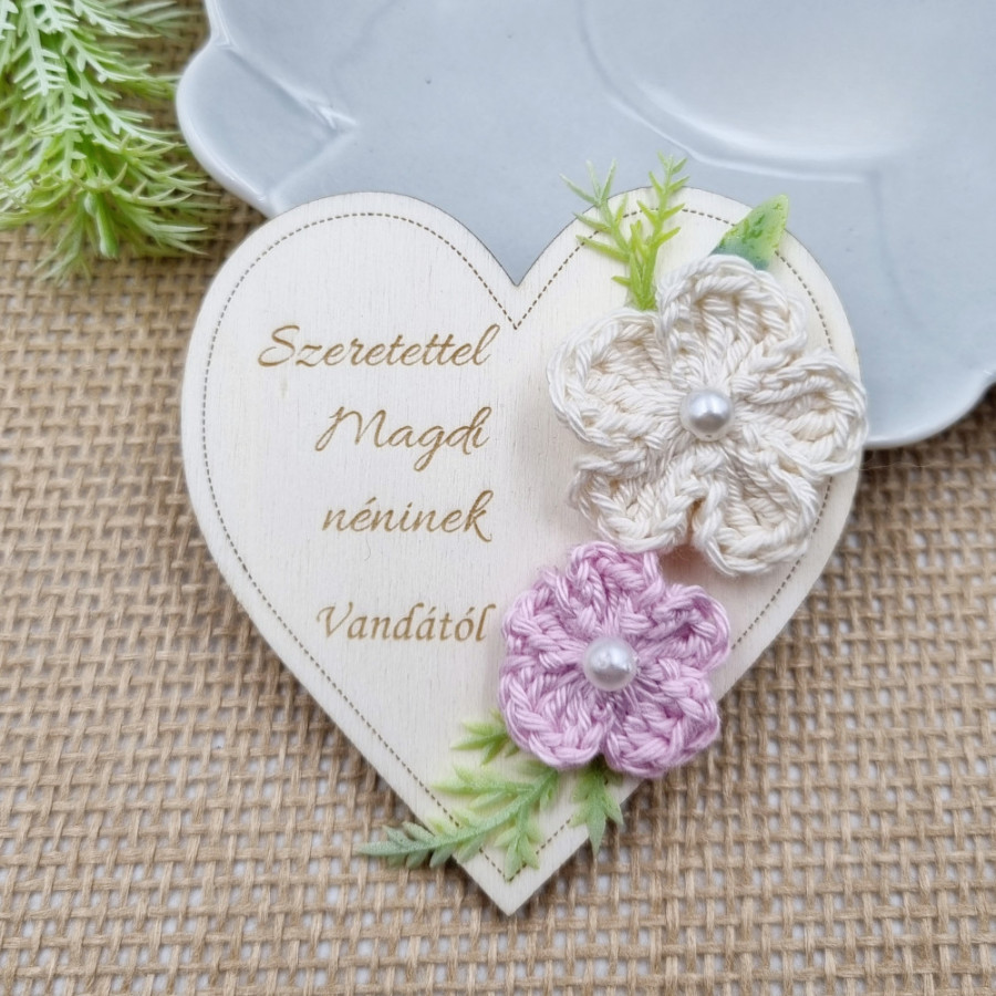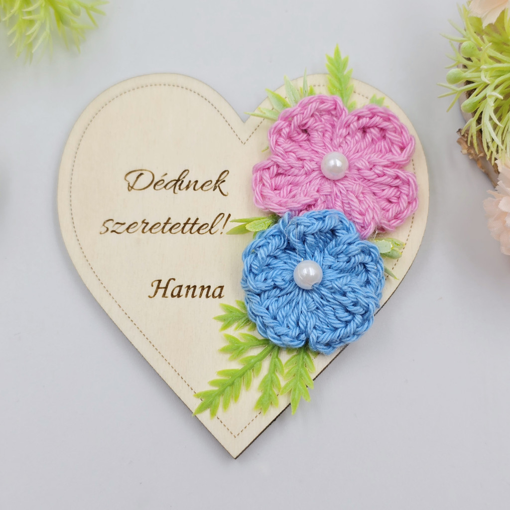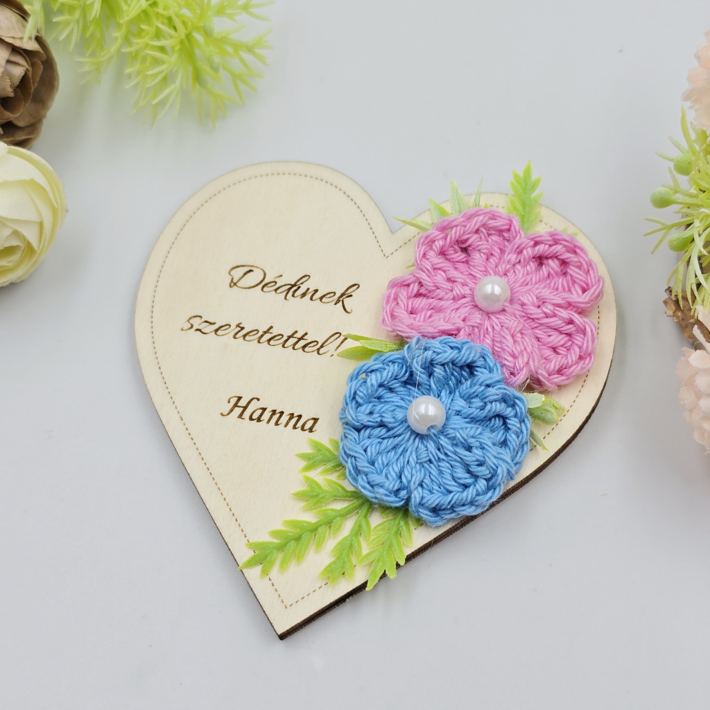 Gravírozott fa hűtőmágnes egyedi felirattal, horgolt virágokkal (20 féle szín)