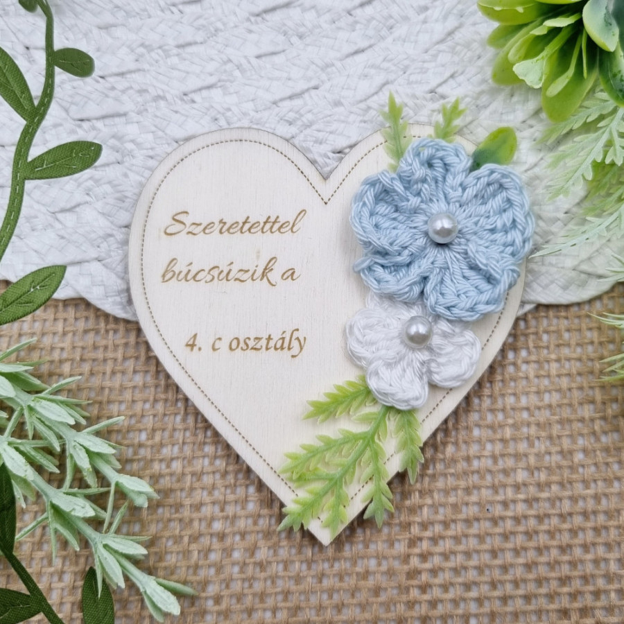 Személyre szabott, kézműves fa hűtőmágnes horgolt virágokkal és egyedi gravírozott felirattal. Tökéletes ajándék tanároknak és óvó néniknek ballagásra, pedagógusnapra vagy évzáróra.