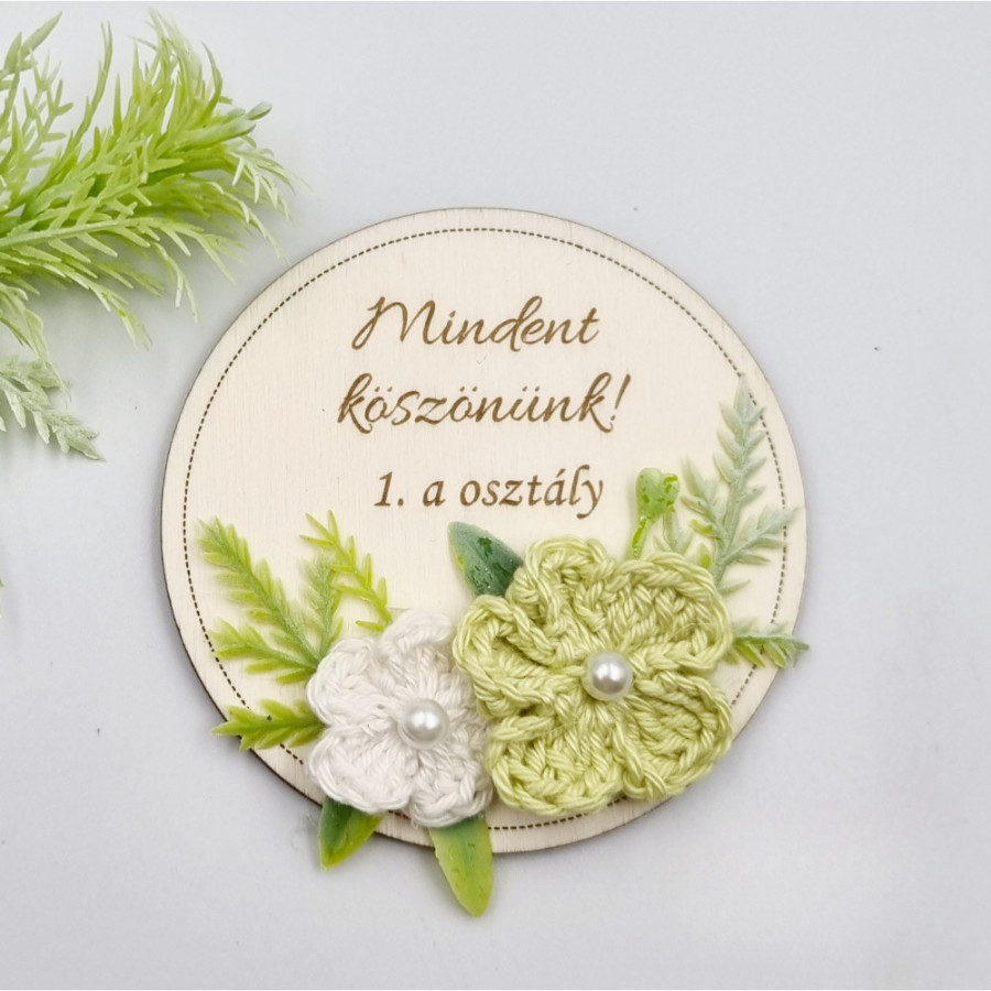 Személyre szabott, kézműves fa hűtőmágnes horgolt virágokkal és egyedi gravírozott felirattal. Tökéletes ajándék tanároknak és óvó néniknek ballagásra, pedagógusnapra vagy évzáróra.