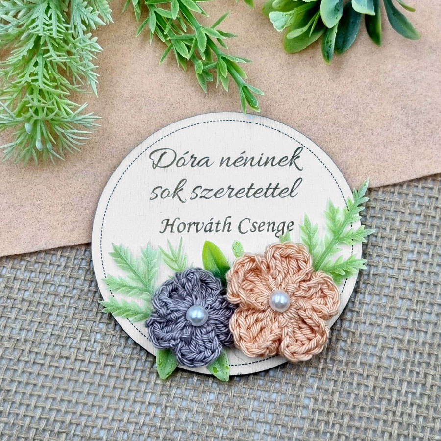 Gravírozott fa hűtőmágnes egyedi felirattal, horgolt virágokkal (20 féle szín)