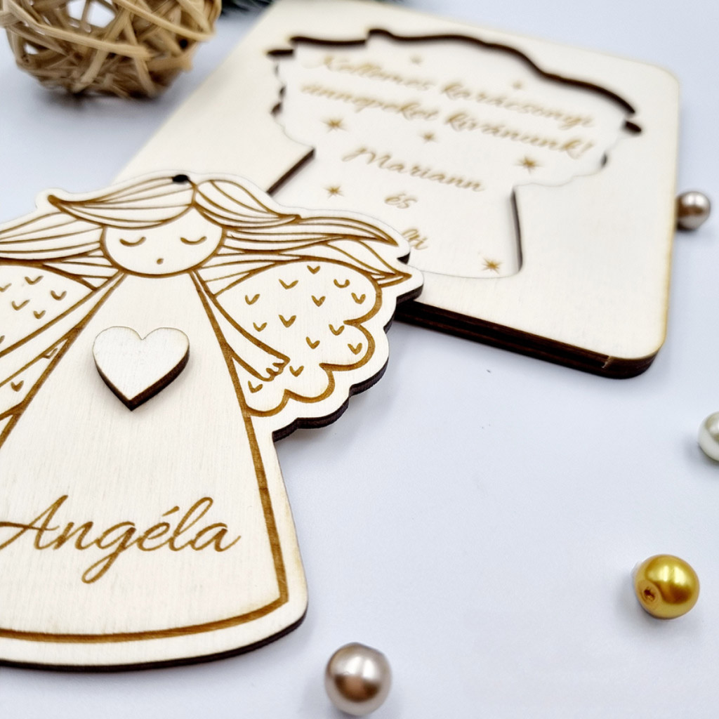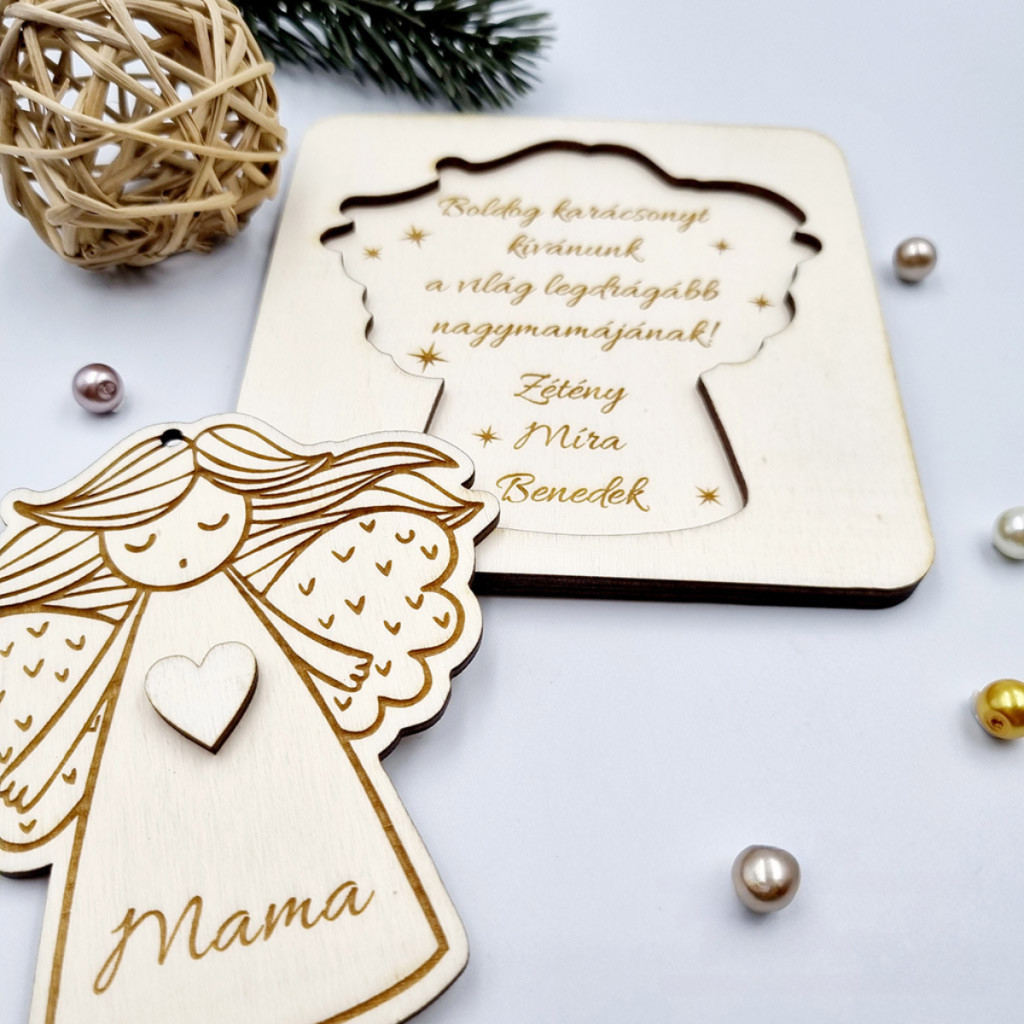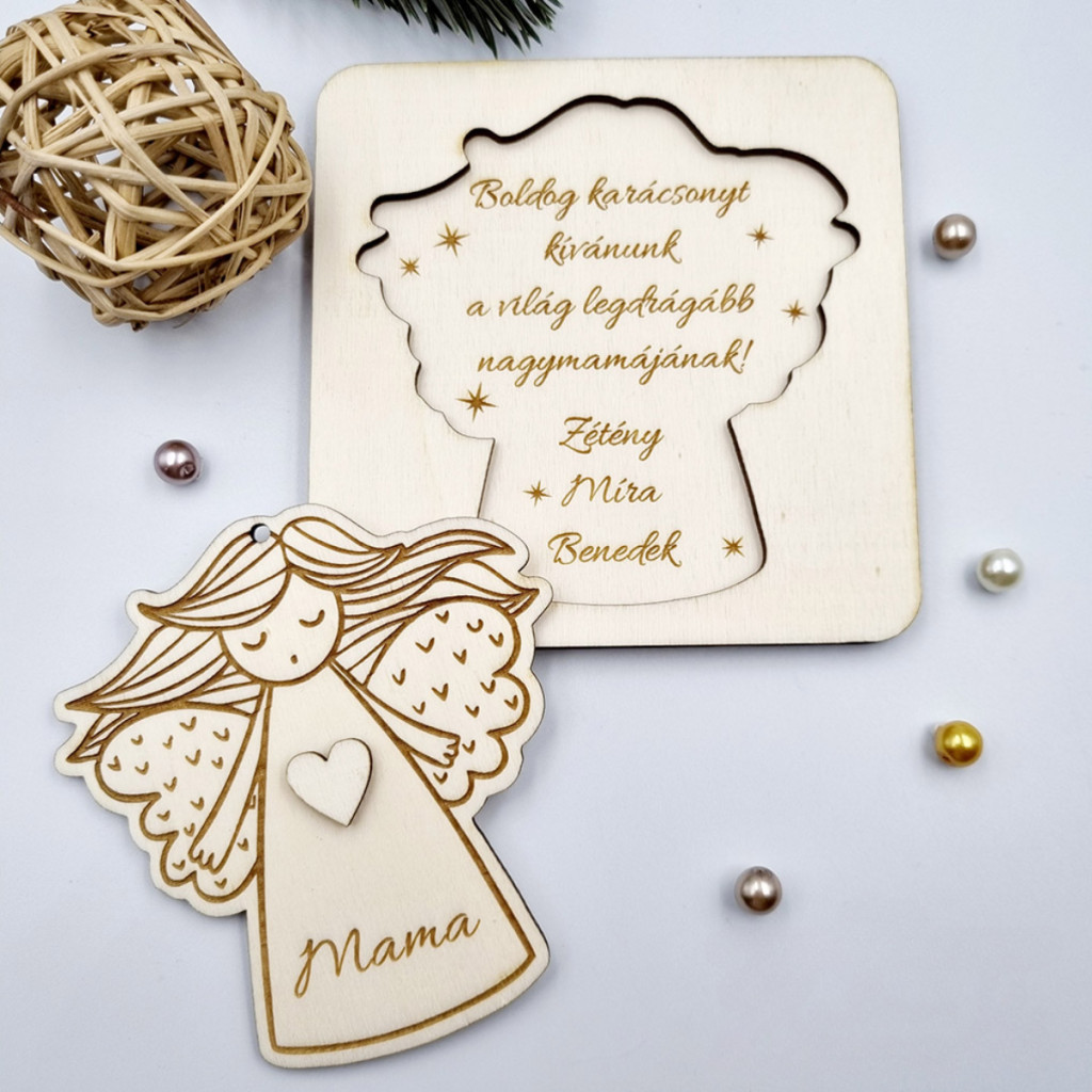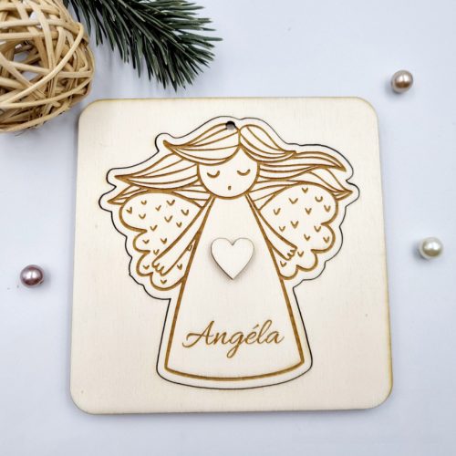 Gravírozott fa karácsonyfadísz angyalkával és üzenetküldő kerettel. Egyedi névvel és személyes felirattal kérhető.