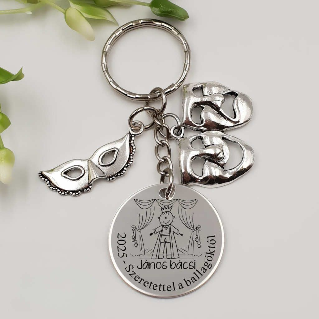 A kulcstartó gravírozható nemesacél medállal készül, amely egyedivé tehető. A drámatanár figura mellé a tanár neve, az alsó íves részre pedig személyes üzenet kerülhet, például: „Köszönettel: 12.b osztály”, „Szeretettel: Feri bácsinak!” Ez az egyedi gravírozás igazán különlegessé és emlékezetessé teszi az ajándékot.
