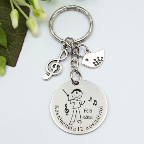 A kulcstartó nemesacél medáljára a tanár neve vagy egy kedves üzenet gravírozható, pl. a figura mellé: János bácsi, alsó íves rész: „Köszönjük az énekórákat!”, vagy: „Szeretettel a 8.z osztálytól.”