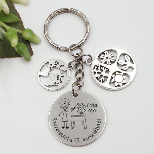 A kulcstartó nemesacél medáljára a figura mellé a tanár neve és az alsó íves részre bármilyen egyedi felirat is gravírozható. Pl.: „Köszönjük a 12.b osztály nevében”. "Szeretettel a 8.d osztálytól!" stb. Ez garantáltan személyessé és különlegessé teszi az ajándékot.