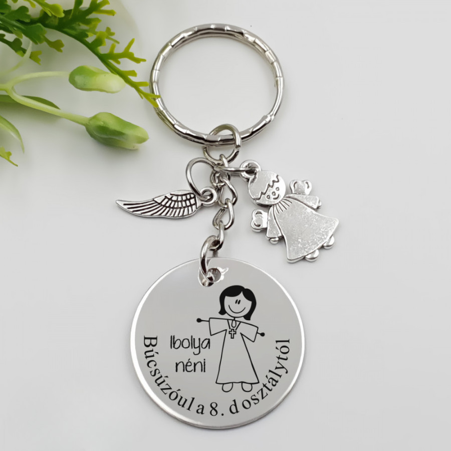 A kulcstartó nemesacél medáljára a figura mellé a tanár neve és az alsó íves részre bármilyen egyedi felirat is gravírozható. Pl.: „Köszönjük a 12.b osztály nevében”. "Szeretettel a 8.d osztálytól!" stb. Ez garantáltan személyessé és különlegessé teszi az ajándékot.