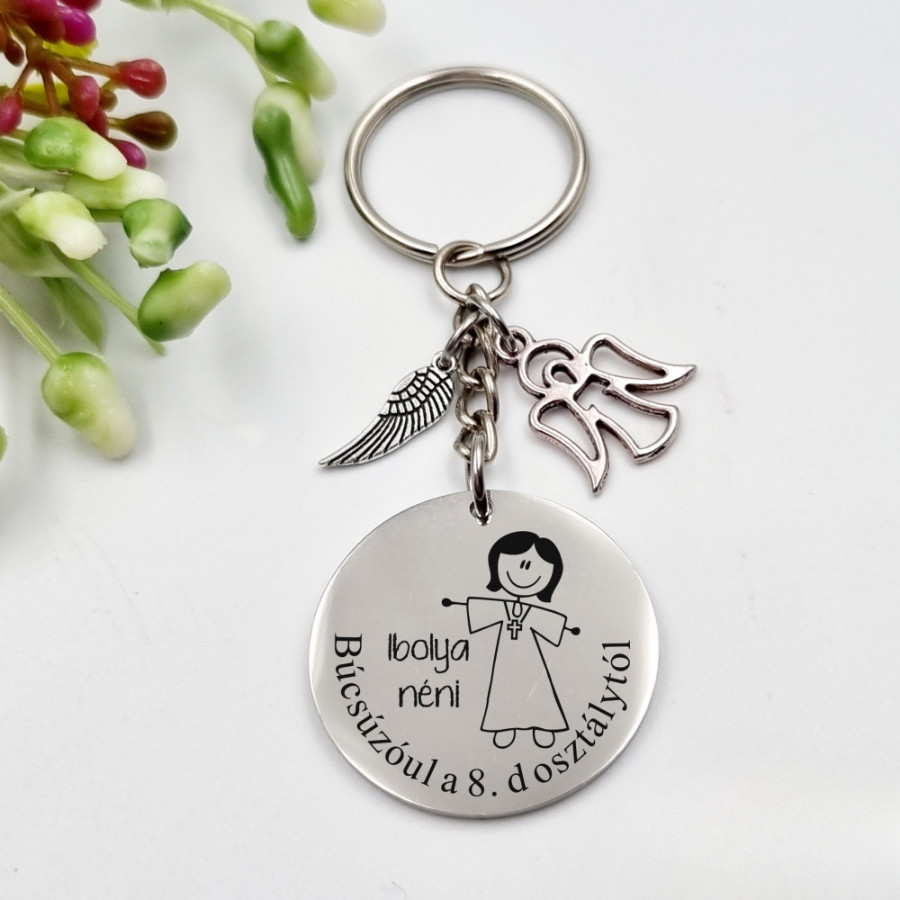 A kulcstartó nemesacél medáljára a figura mellé a tanár neve és az alsó íves részre bármilyen egyedi felirat is gravírozható. Pl.: „Köszönjük a 12.b osztály nevében”. "Szeretettel a 8.d osztálytól!" stb. Ez garantáltan személyessé és különlegessé teszi az ajándékot.