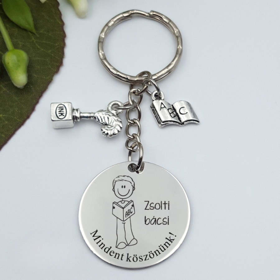 A kulcstartó nemesacél medáljára a figura mellé a tanár neve és az alsó íves részre bármilyen egyedi felirat is gravírozható. Pl.: „Köszönjük a 12.b osztály nevében”. "Szeretettel a 8.d osztálytól!" stb. Ez garantáltan személyessé és különlegessé teszi az ajándékot.