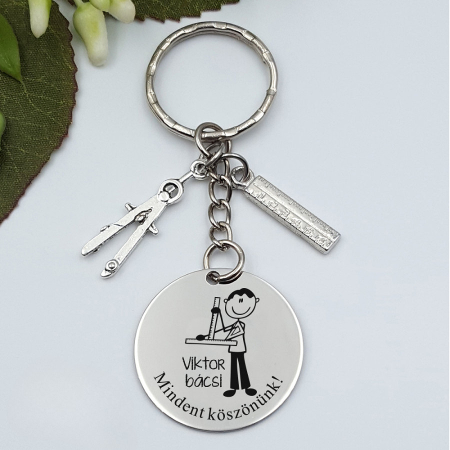 A kulcstartó nemesacél medáljára a figura mellé a tanár neve és az alsó íves részre bármilyen egyedi felirat is gravírozható. Pl.: „Köszönjük a 12.b osztály nevében”. "Szeretettel a 8.d osztálytól!" stb. Ez garantáltan személyessé és különlegessé teszi az ajándékot.