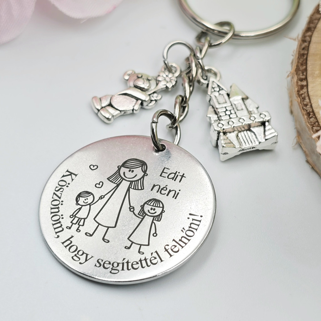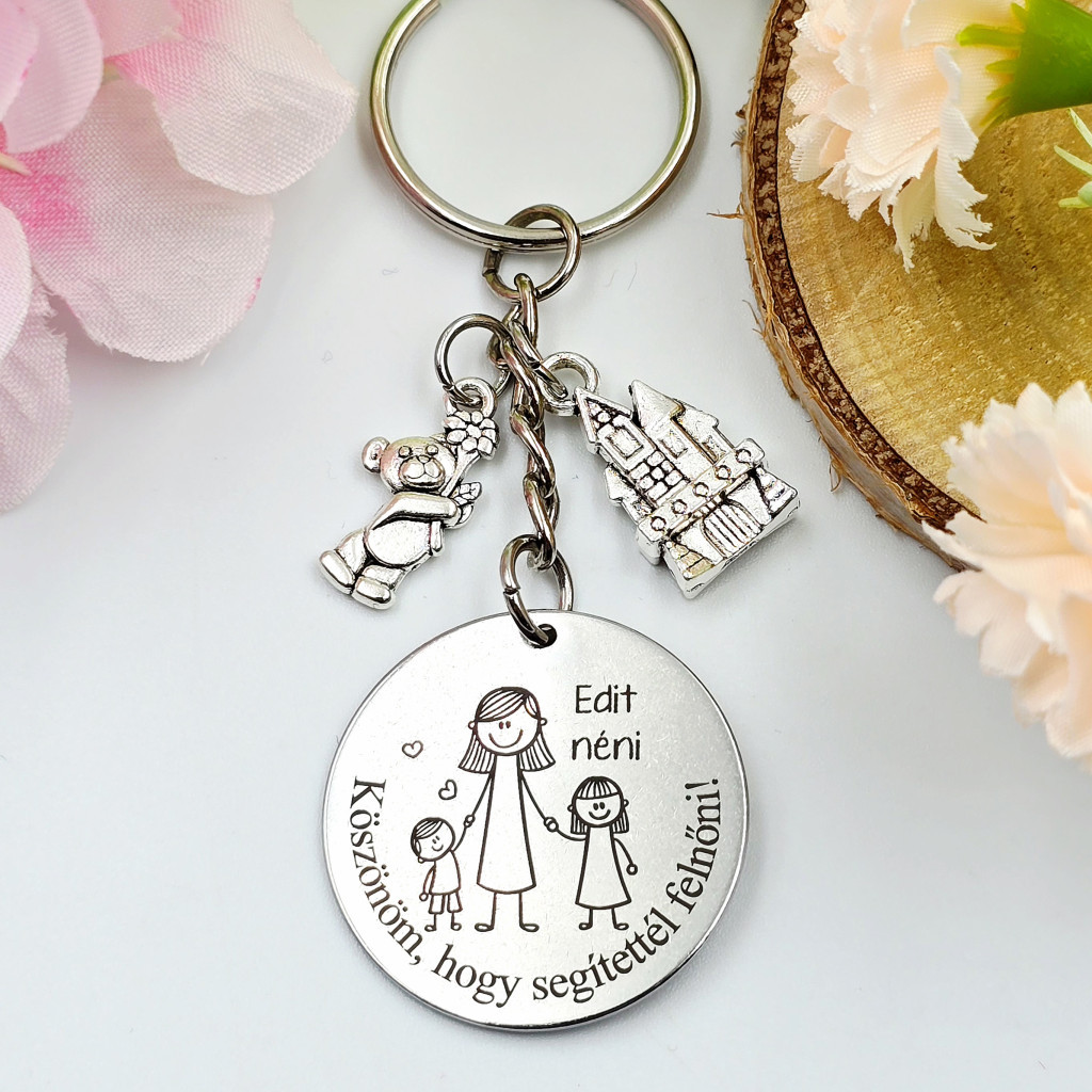 Egyedi gravírozott kulcstartó óvó néniknek – különleges ajándék charmokkal