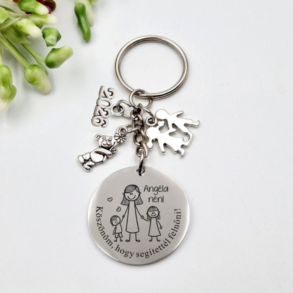 Egyedi gravírozott kulcstartó óvó néniknek – különleges ajándék charmokkal