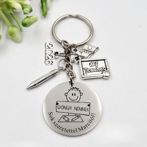 A kulcstartó nemesacél medáljára a figura kezében lévó táblára a tanító neve és az alsó íves részre bármilyen egyedi felirat is gravírozható. Pl.: „Mindent köszönünk”. "Szeretettel Noeltől!" stb. Ez garantáltan személyessé és különlegessé teszi az ajándékot.