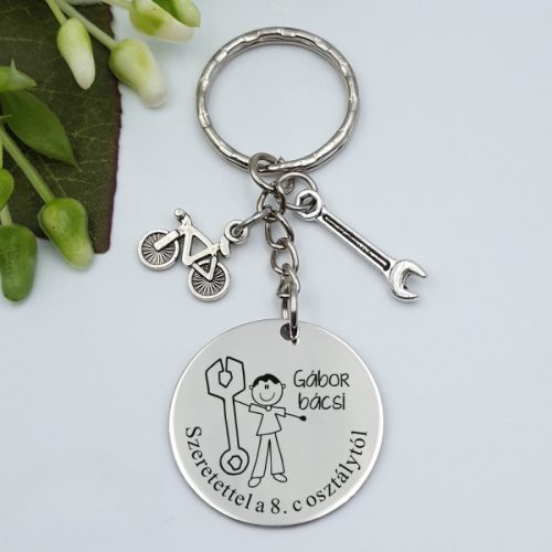 A kulcstartó bicikli, villáskulcs charmjai cinkötvözetből készültek, és remekül illenek a technikatanár témához.