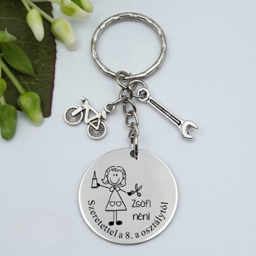 A kulcstartó nemesacél medáljára a figura mellé a tanár neve és az alsó íves részre bármilyen egyedi felirat is gravírozható. Pl.: „Köszönjük a 12.b osztály nevében”. "Szeretettel a 8.d osztálytól!" stb. Ez garantáltan személyessé és különlegessé teszi az ajándékot.