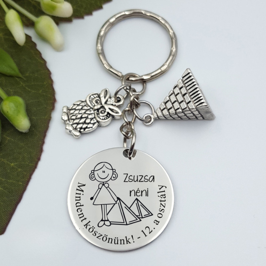 A kulcstartó nemesacél medáljára a figura mellé a tanár neve és az alsó íves részre bármilyen egyedi felirat is gravírozható. Pl.: „Köszönjük a 12.b osztály nevében”. "Szeretettel a 8.d osztálytól!" stb. Ez garantáltan személyessé és különlegessé teszi az ajándékot.