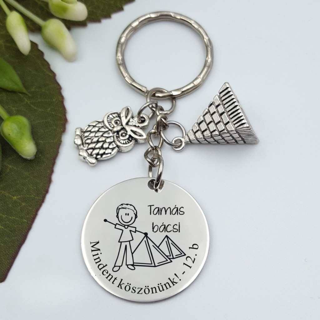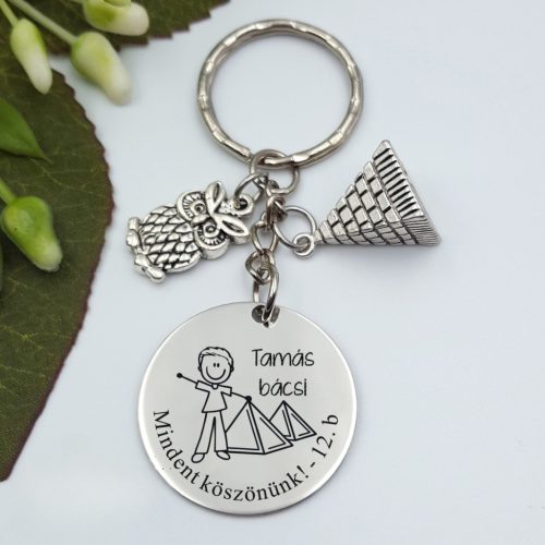 A kulcstartó nemesacél medáljára a figura mellé a tanár neve és az alsó íves részre bármilyen egyedi felirat is gravírozható. Pl.: „Köszönjük a 12.b osztály nevében”. "Szeretettel a 8.d osztálytól!" stb. Ez garantáltan személyessé és különlegessé teszi az ajándékot.