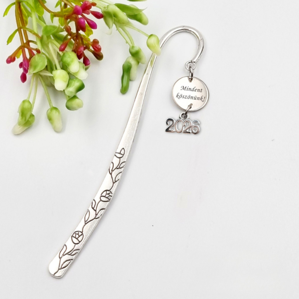 Személyre szabható, gravírozott könyvjelző 2026 évszám charmmal, amely tökéletes ballagási ajándék óvó néniknek, pedagógusoknak, vagy év végi ajándék tanároknak.