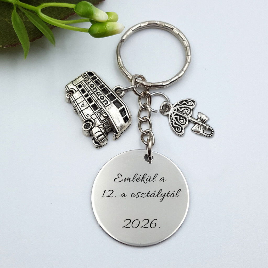 Lepd meg angoltanárodat egy elegáns, személyre szabott kulcstartóval, amelyet nemesacél medállal és egyedi gravírozással készítünk. A kulcstartót két különleges charm – egy ikonikus londoni busz és egy esernyő – teszi igazán angolos stílusúvá. Ez a különleges ajándék ideális választás bármely iskolai eseményre vagy ünnepi alkalomra!