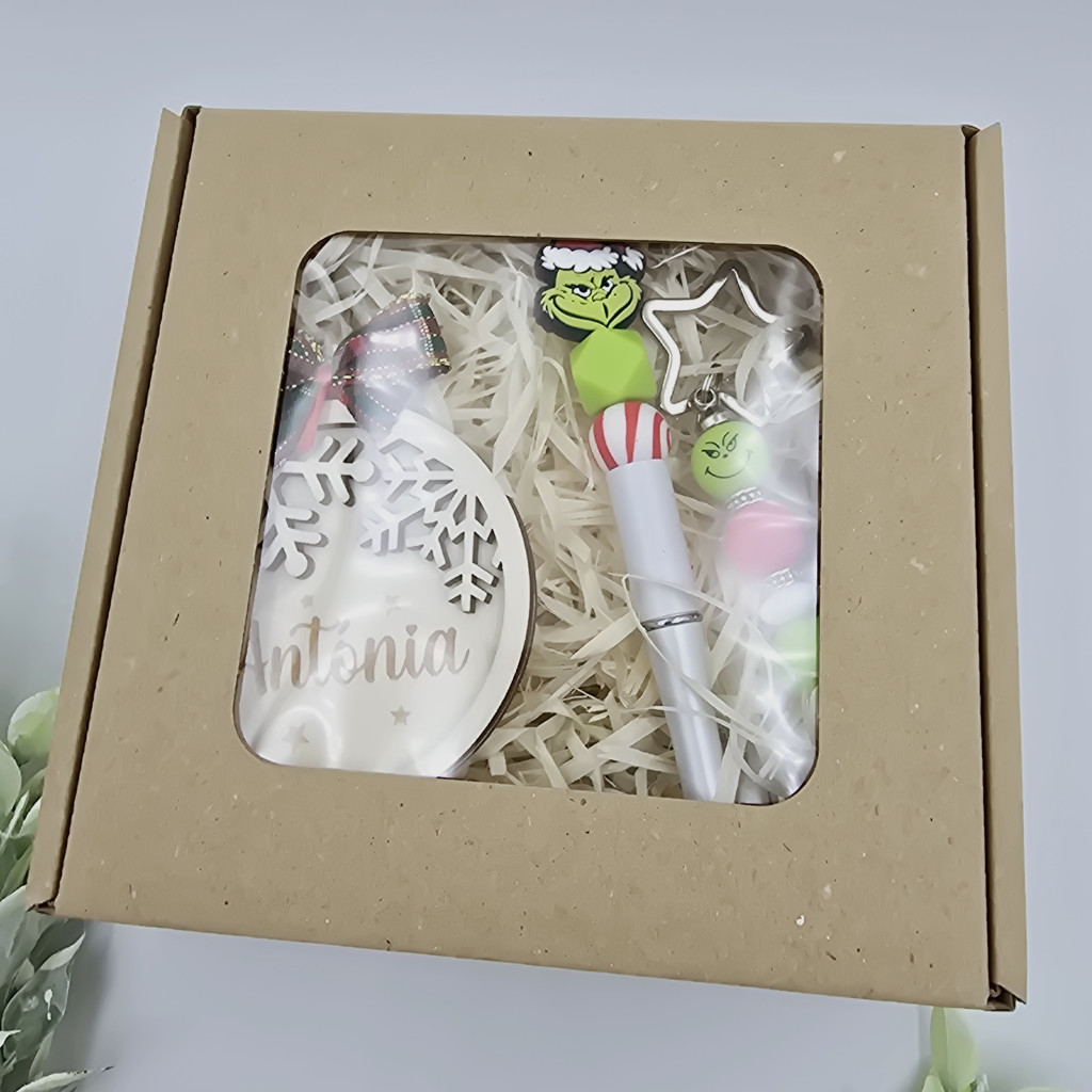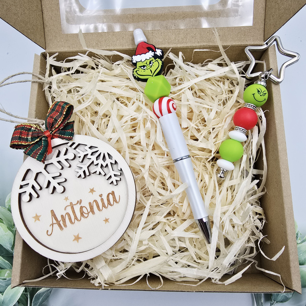 Grinch karácsonyi ajándékdoboz egyedi névvel gravírozott dísszel, tollal és kulcstartóval
