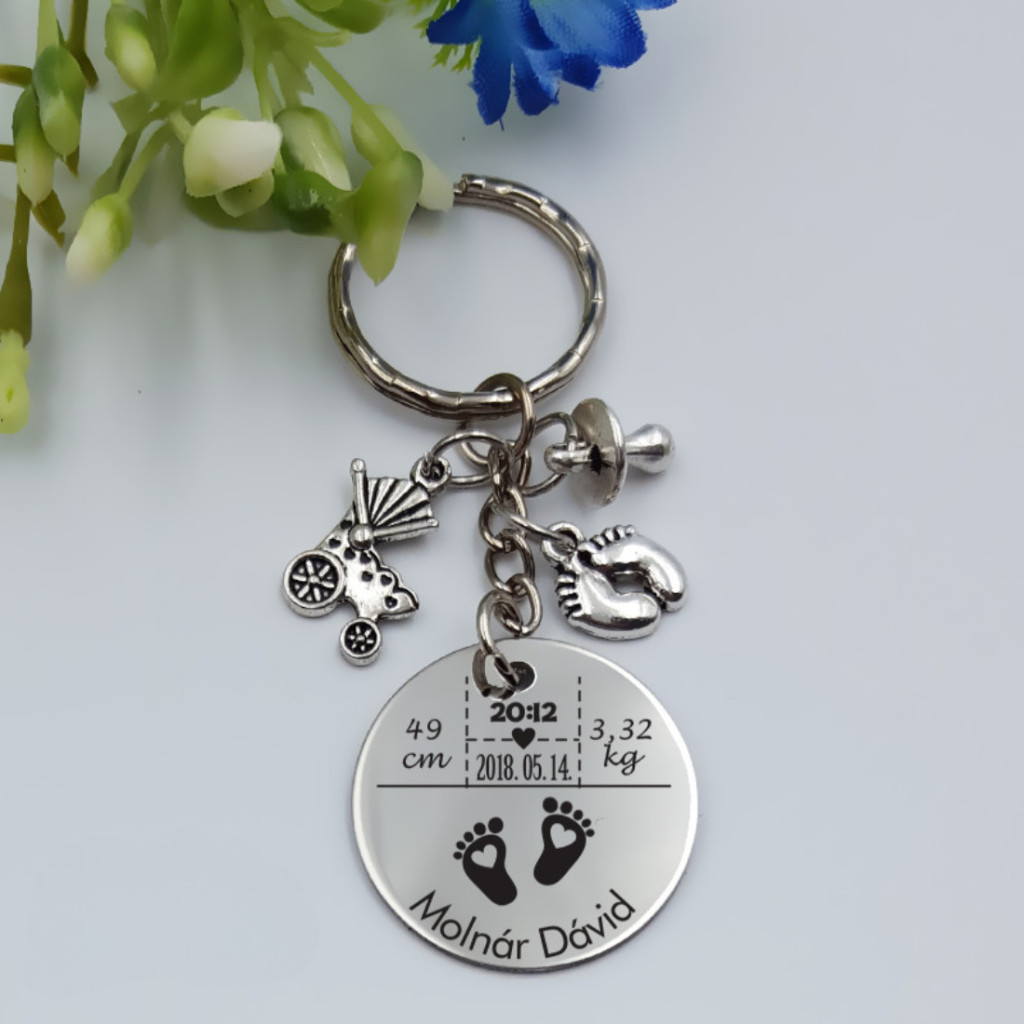 Ezzel az egyedi kulcstartóval mindig magaddal viheted a baba születésének legfontosabb pillanatait. Különleges ajándék lehet újdonsült szülőknek, nagyszülőknek vagy keresztszülőknek!