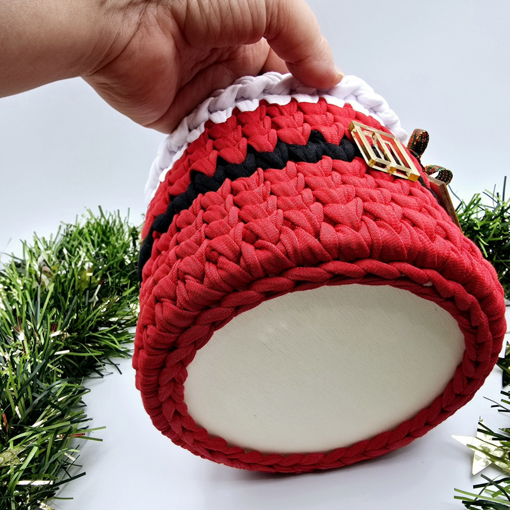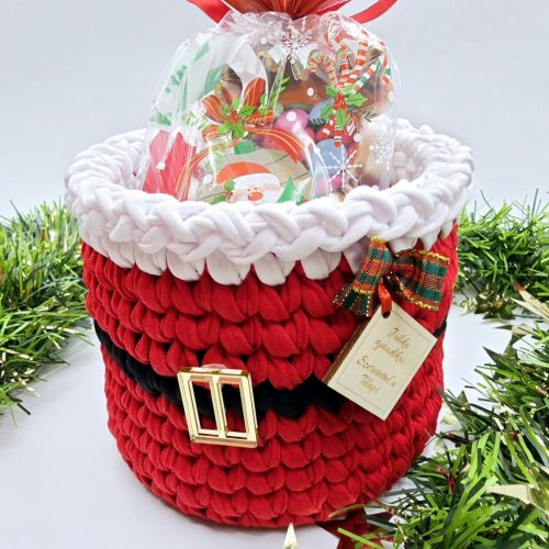 Ez a kézzel horgolt, prémium pólófonalból készült Mikulás tárolókosár a praktikumot és a stílust ötvözi. A kosár elegáns fa talppal készült, ami stabilitást ad, míg a piros, fekete és fehér színek igazi ünnepi hangulatot teremtenek. Kiválóan alkalmas szaloncukrok tárolására, de ajándékcsomagként is megállja a helyét.